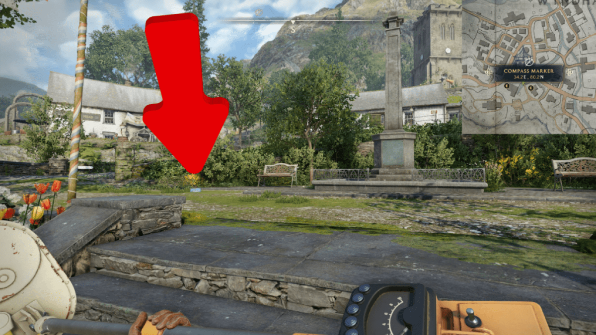 This second Buried Treasure lead will also take you to the Village Green. This cache is located in the eastern section of the area, near the path to the Little Tea Room building. The easiest way to find the treasure here is to align yourself with the sign to the right of the Union Jack flag next to the gazebo stairs, which reads “STAY INFORMED DAILY BRIEFINGS HELD HERE.”