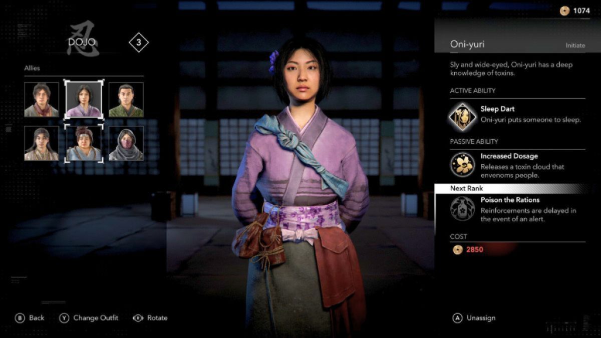 Oni-yuri is an optional ally in Assassin’s Creed Shadows who joins the League if you choose to spare her in the quest to take down the pirates. She’s great with poison and will knock enemies out in combat while evading detection. At maximum level, summoned reinforcements will be delayed, which could be the difference between completing an area’s goals and getting out safely or getting stuck in endless rounds of brutal combat.